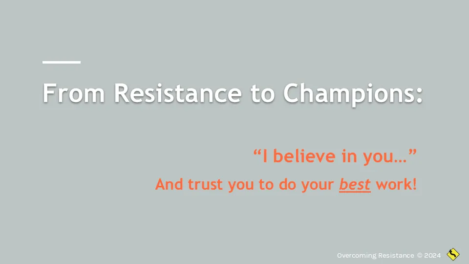 Remember that one person who always says "we've tried that before"? Steps 2 and 3 show how to turn your biggest skeptics into your strongest advocates. Magic. (You should also check out the companion mini course with 5 Solutions to Overcome or Eliminate Resistance to Change!)